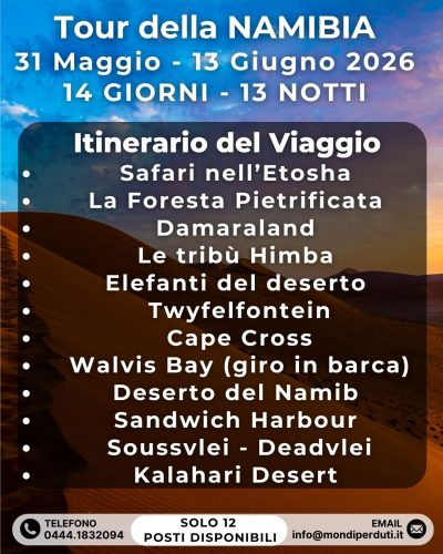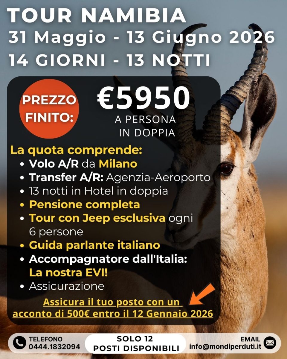 Ad inizio Giugno, scopri insieme a noi la magia della Namibia, una terra potente e primordiale dove il silenzio del deserto incontra l’energia della fauna africana. Un tour esclusivo di 14 giorni tra safari emozionanti, culture ancestrali e scenari che sembrano usciti da un film. ❤️